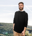 50% organic cotton/50% recycled polyester. Raglan sleeves. Fully fashioned knit. Ribbed collar, cuffs and hem. Navy blue herringbone taped neck. Personalisation patch inside neck. Tag free. Recycled polyester is made from post-consumer waste.
