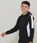 100% polyester. Brushed back fleece. Drop shoulder style. Three panel hood. Crossover neck detail. Contrast shoulder, upperarm and side panels (black and navy are self colour). Two front zip pockets. Ribbed cuffs and hem. Tear out label.
